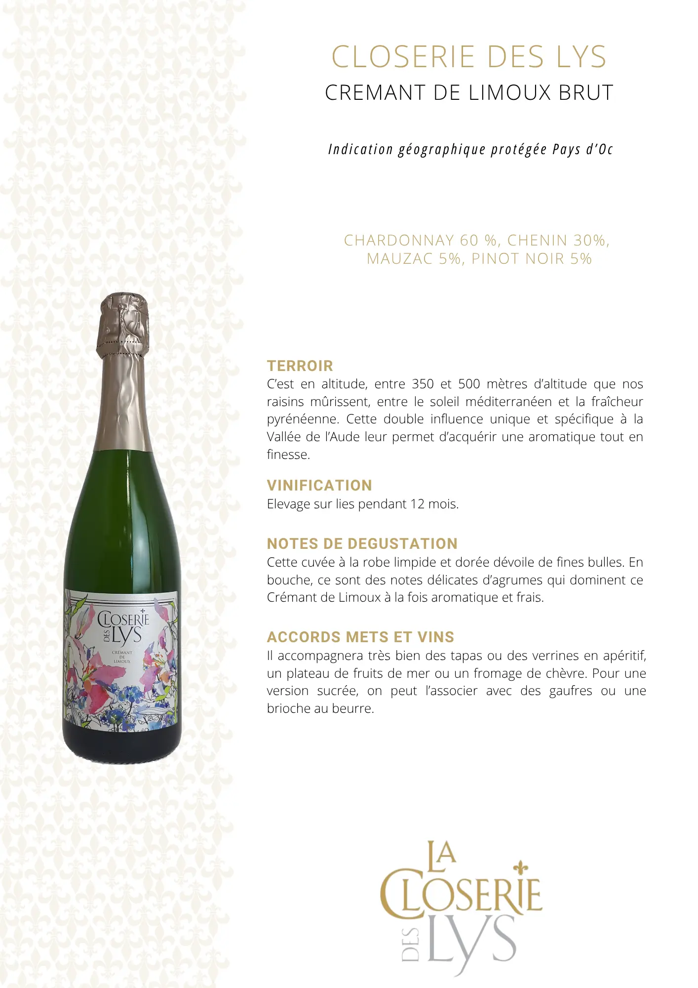 Cette cuvée à la robe limpide et dorée dévoile de fines bulles. En bouche, ce sont des notes délicates d’agrumes qui dominent ce Crémant de Limoux à la fois aromatique et frais.